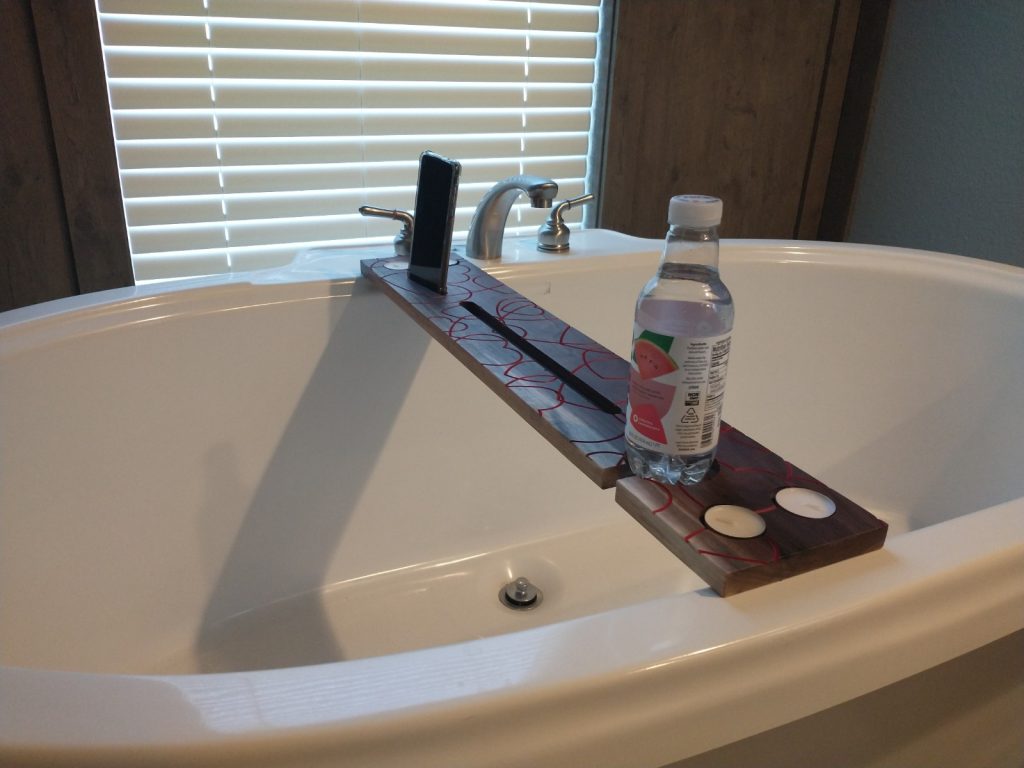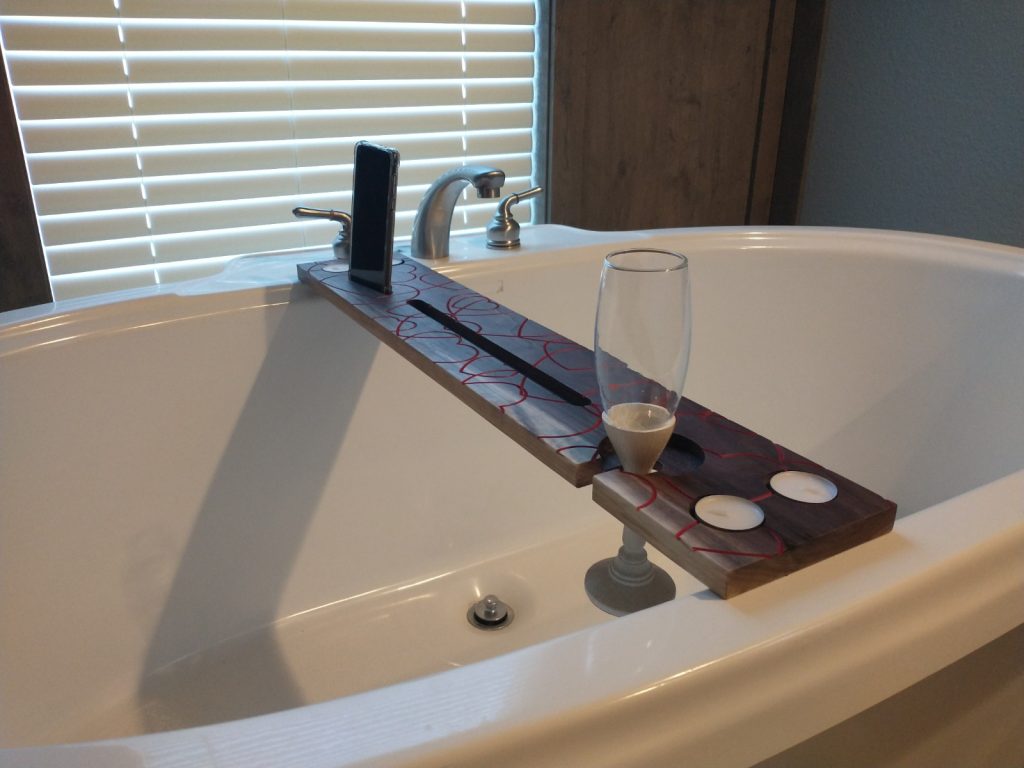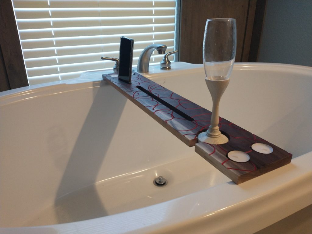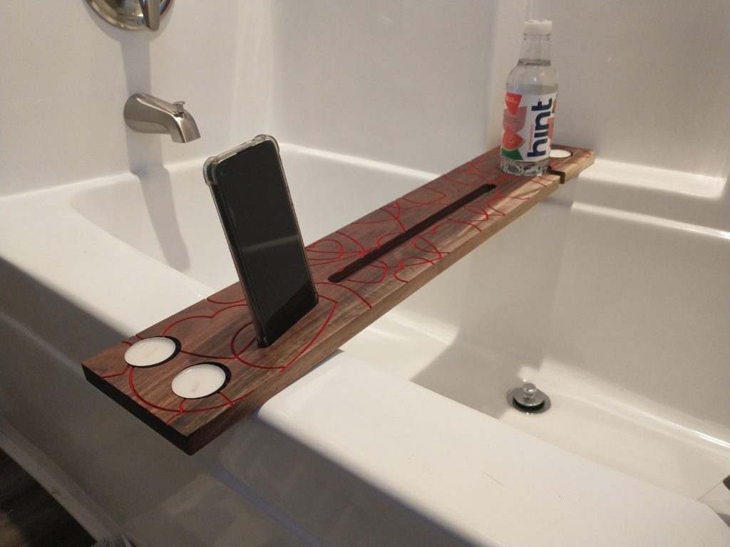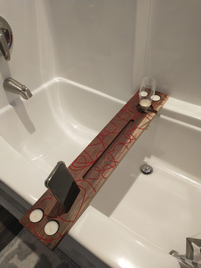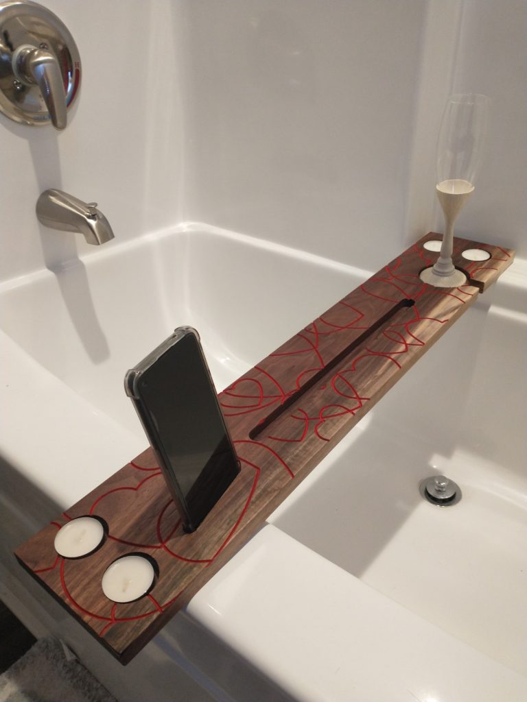 This year I decided to make a few bath boards. They are all similar to the one pictured. Made out of walnut with a custom Valentines Day engraving. Includes slots for tea lights, phone, iPad, wine glass and 12oz can. Perfect for that quiet bubble bath all to yourself.